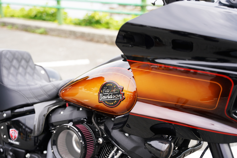 相棒となったのは、ハーレーダビッドソン FXLRST、通称ローライダーST。その中でも「タバコフェード」と呼ばれるカラーリングを纏った、日本限定170台の特別モデルだ。深みのあるブラウンからブラックへと移ろうグラデーションは、クラシカルでありながら力強く、走り出す前から強い存在感を放っている。